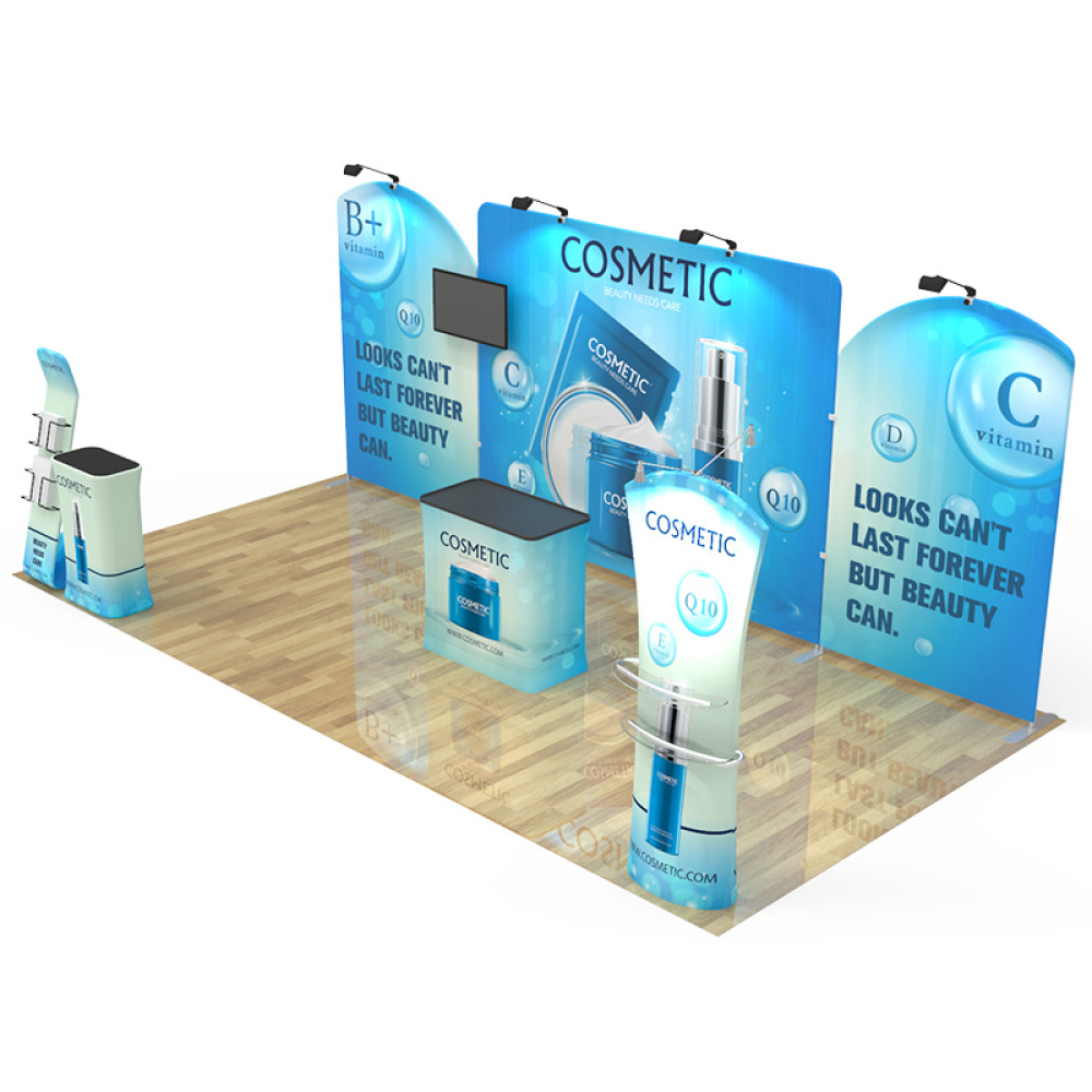 Featuring 1 custom sectorial top tension fabric backwall display, 2 curved top tension fabric backwall displays, 2 monitor brackets, 4 trade show display LED lights and light clips, 2 tension fabric shelving kits, 1 tension fabric iPad, tablet and literature banner stand, and 1 hard case to podium printed graphic, this booth has the ability to engage any audience.